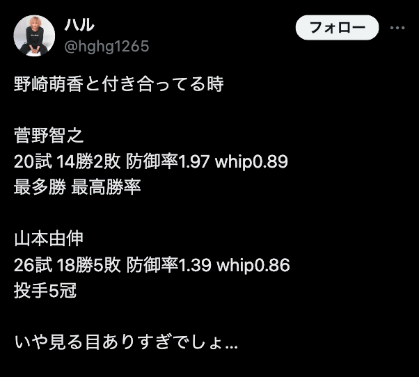 また野崎萌香は数ヶ月前まで、野球選手の菅野智之と交際していました。菅野智之と山本由伸は先輩後輩の間柄。野崎萌香は恋愛経験の豊富さと節操のなさから「地雷女」と呼ばれ、山本由伸を祝福する声はあまり聞かれませんでした。