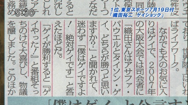 東スポもゲイ疑惑に悪ノリし、世界陸上選手権が開催された時に「アサファ・パウエル」と「タイソン・ゲイ」のどちらが勝つのか質問をした事がありました。この時に織田裕二は「僕はゲイですよ!絶対ゲイです」と答えたとされており、ある意味で悪意のある書き方です。