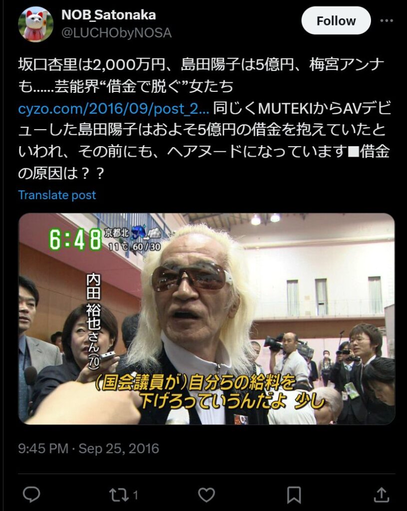国際派女優として活躍した島田陽子さんはお金にルーズであり、歌手の内田裕也さんにお金を貢いだために、借金が約5億円あったといわれています。仕事が激減したことにより2億5千万円の借入で建てた住宅ローンの支払いができなくなり、固定資産税と市民税を4年分滞納していたことも発覚。そのほかの未払いも続々発覚し、AVにも出演し借金の返済をしていました。