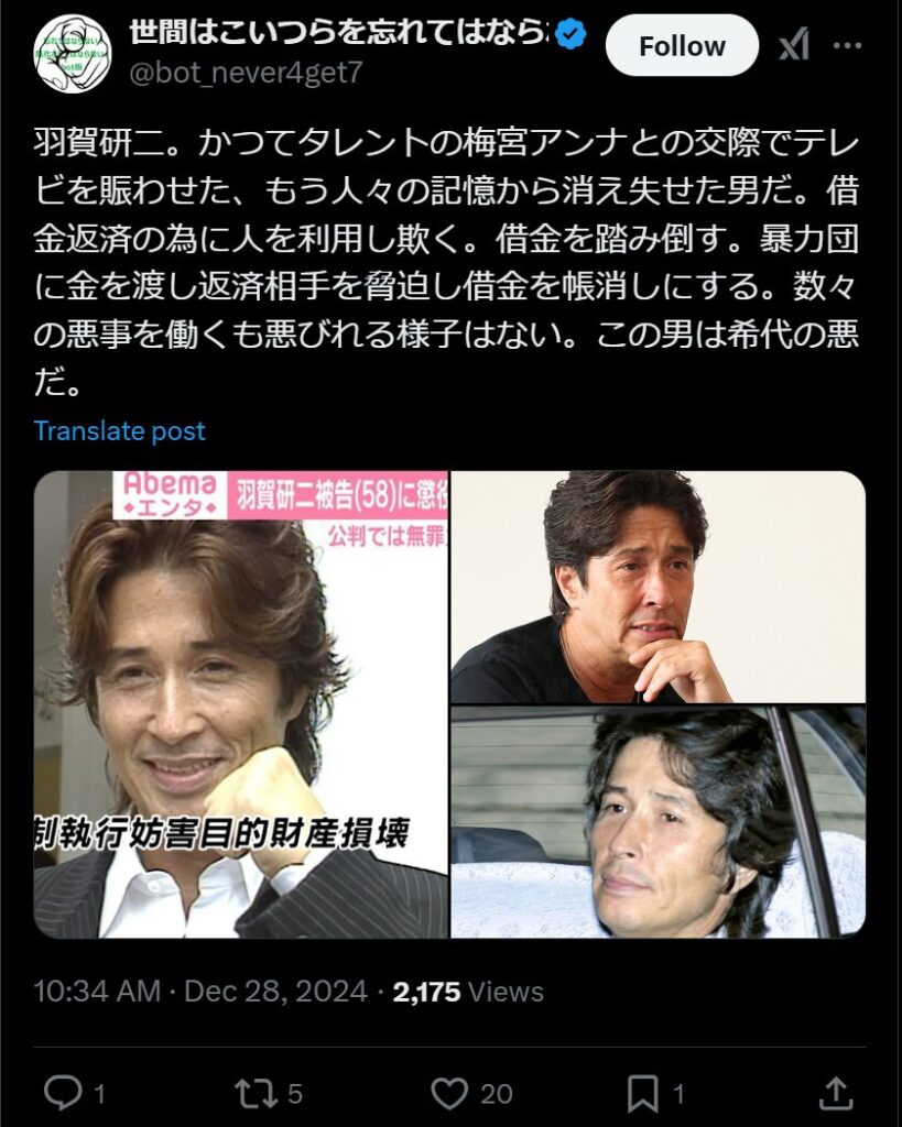 1998年に沖縄のショッピングモールに3店舗オープンするときに、開店当日に3000万円の未払いがあることを梅宮さんに告げ、連帯保証人になってもらったといいます。最終的に梅宮さんは、羽賀さんの借金のうちの8000万円を肩代わりしたそうです。梅宮さんとの破局後、2007年に未公開株の詐欺事件で逮捕されています。そして2016年に詐欺事件の民事裁判にて4億円の支払いが命じられるも支払う気はなく、財産隠しで再逮捕されました。