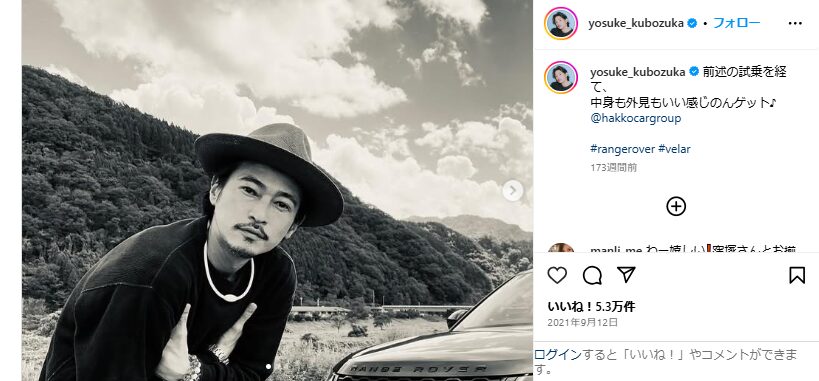 窪塚さんはインスタ上で2021年5月にレンジローバーを試乗しに行ったと報告しており、9月に購入しています。現在大阪に在住しており数年車を保有していなかったという窪塚さんですが、購入後に「中身も外見もよい」と非常に気に入っているそうです。