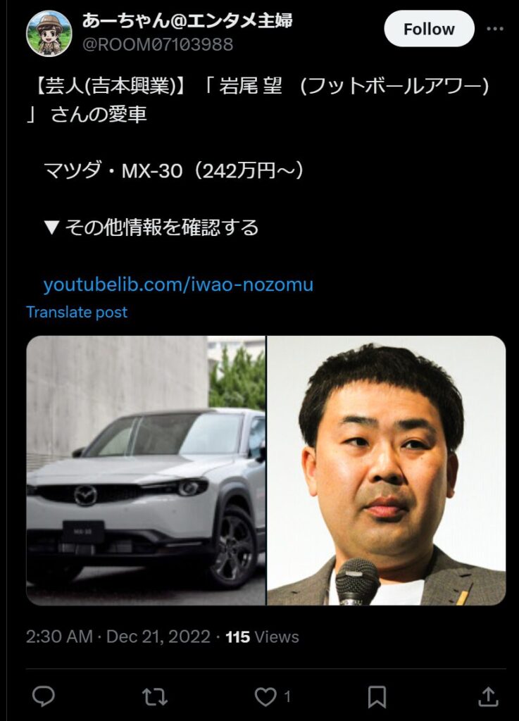 お笑いコンビ「フットボールアワー」のボケ担当である岩尾望さんの愛車は、以前はメルセデスベンツやアウディを所有していたそうですが、現在はマツダのDR型のシルバーに乗っているといいます。YouTubeの企画で購入したそうで、およそ360万円で購入したそうです。