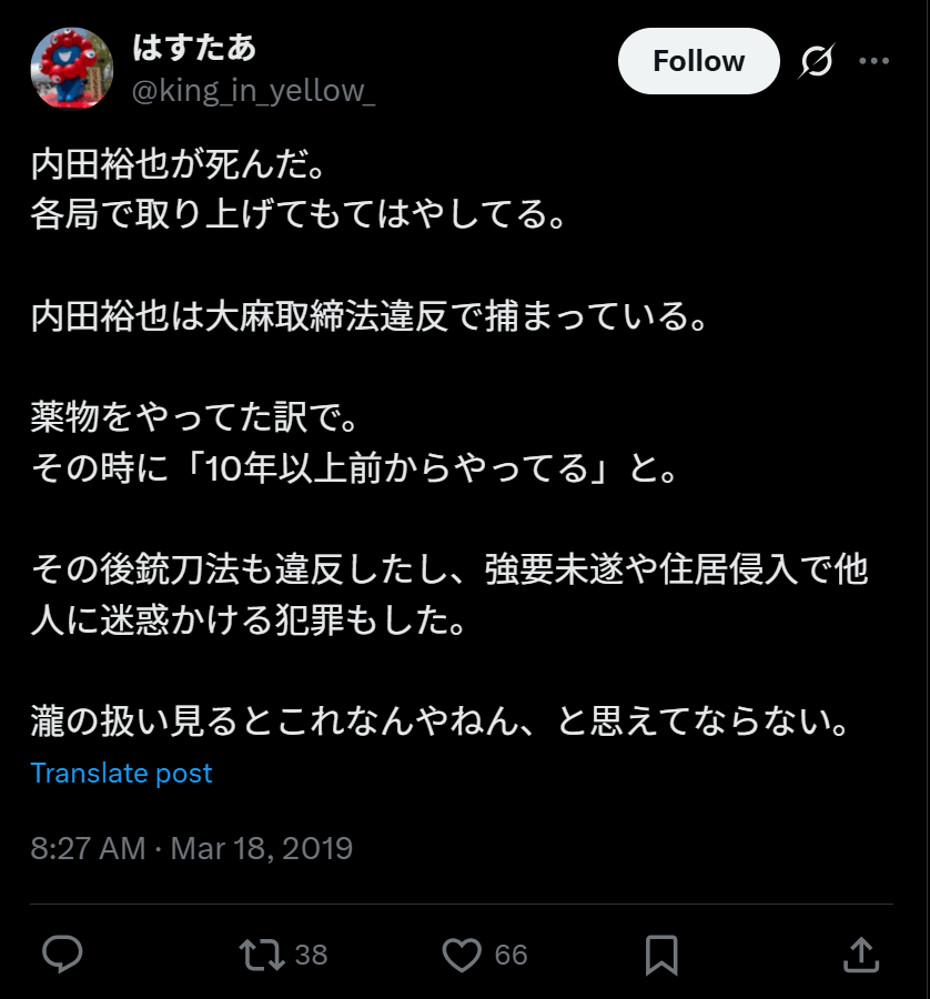 1回目の大麻所持により逮捕された時には起訴猶予処分となったものの、「大麻はアルコールよりも健康的」と発言し悪いこととは思っていなかったようです。とはいうものの薬物での逮捕はないため、この時に薬物とは決別できたのかもしれません。