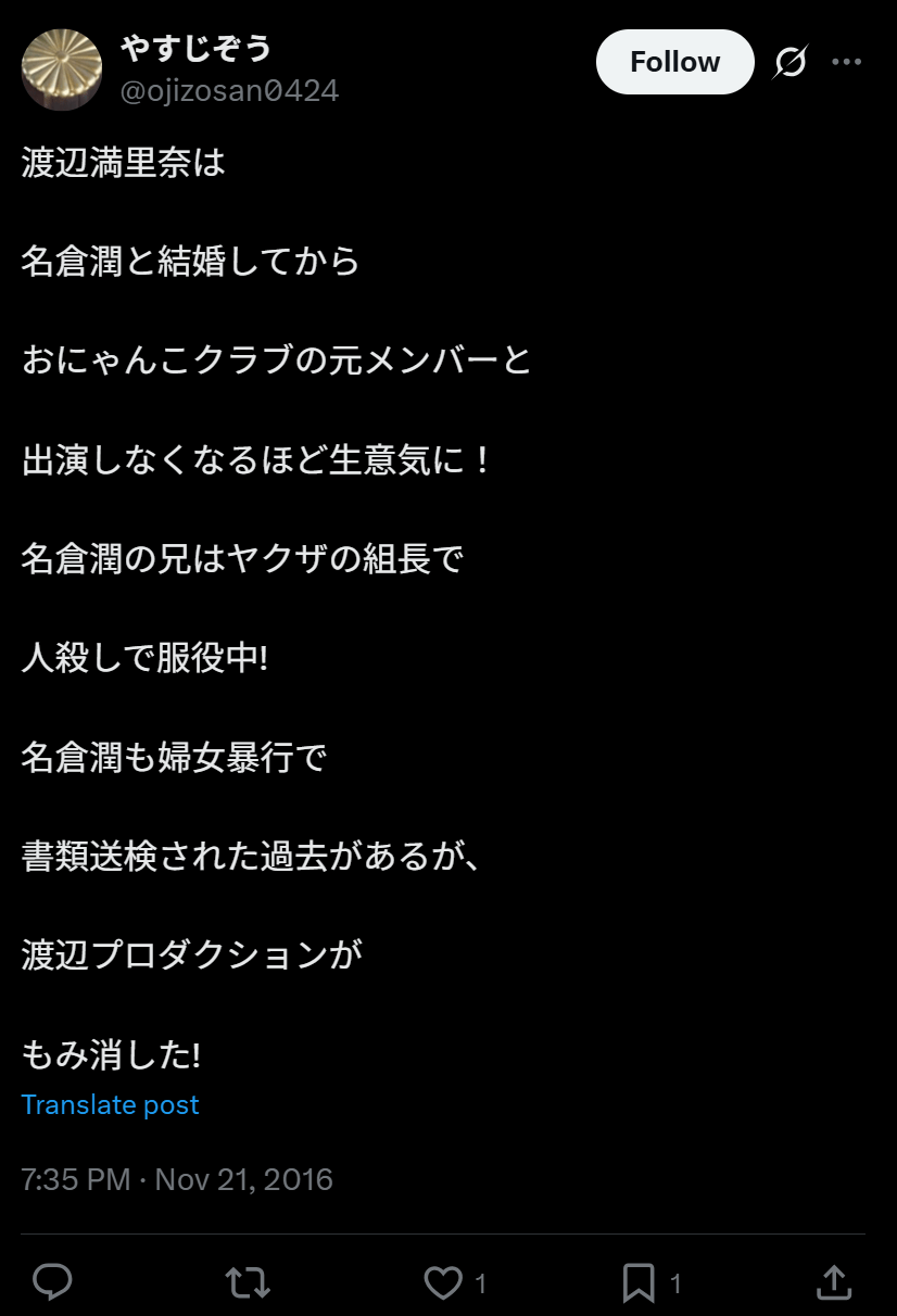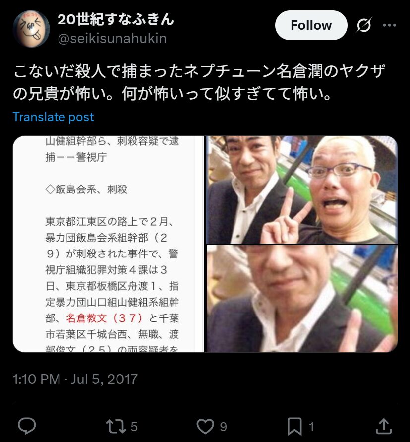 名倉さんの実兄・名倉教文さんは、指定暴力団山口組の山健組系の暴力団「名倉組」組長です。そして2004年に敵対組織の暴力団関係者を刺殺したとして殺人容疑で逮捕されているといいます。実兄は「二代目兼一会若頭代行・名倉組組長」という肩書が報道で判明しています。