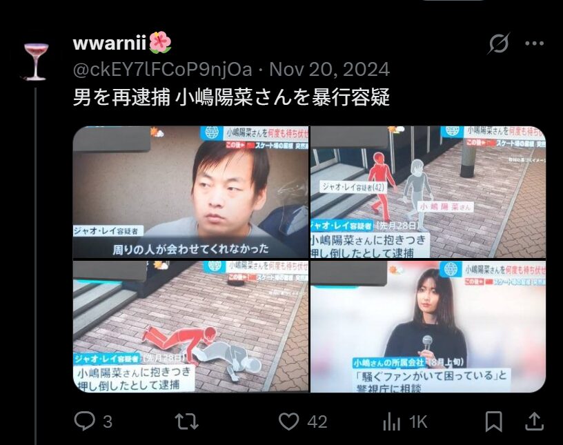 彼女をストーカーしていた相手は中国の留学生である42歳の男で、都内のスクランブル交差点で抱き着き押し倒した容疑で逮捕されました。男はイベントで大声を出し、待ち伏せを繰り返していたといいます。