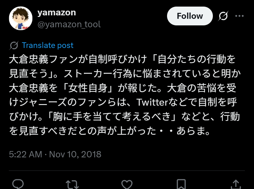 大倉さん曰く「スタッフが注意しようが警察が来ようが関係ない」とのこと。大倉さんは嫌いなものには「家についてくる女の子・しつこい女の子」と答えていたそうで、20年以上ファンからの迷惑行為に悩まされていたようです。