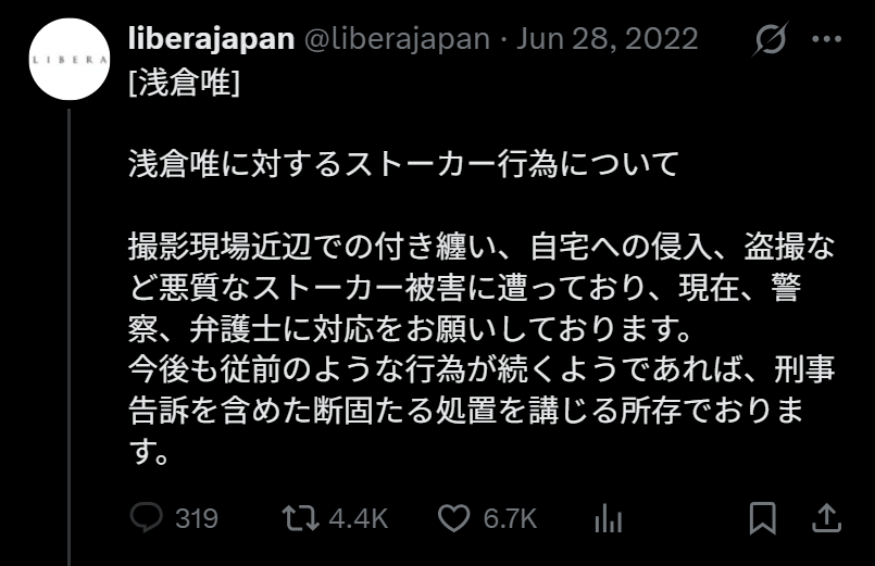 浅倉さんは現場近くでの付きまといや自宅への侵入、盗撮など悪質なストーカー被害にあっていることを報告。度重なる付きまといを不安に感じ、報道時は自宅に帰らずホテル暮らしをしているということでした。