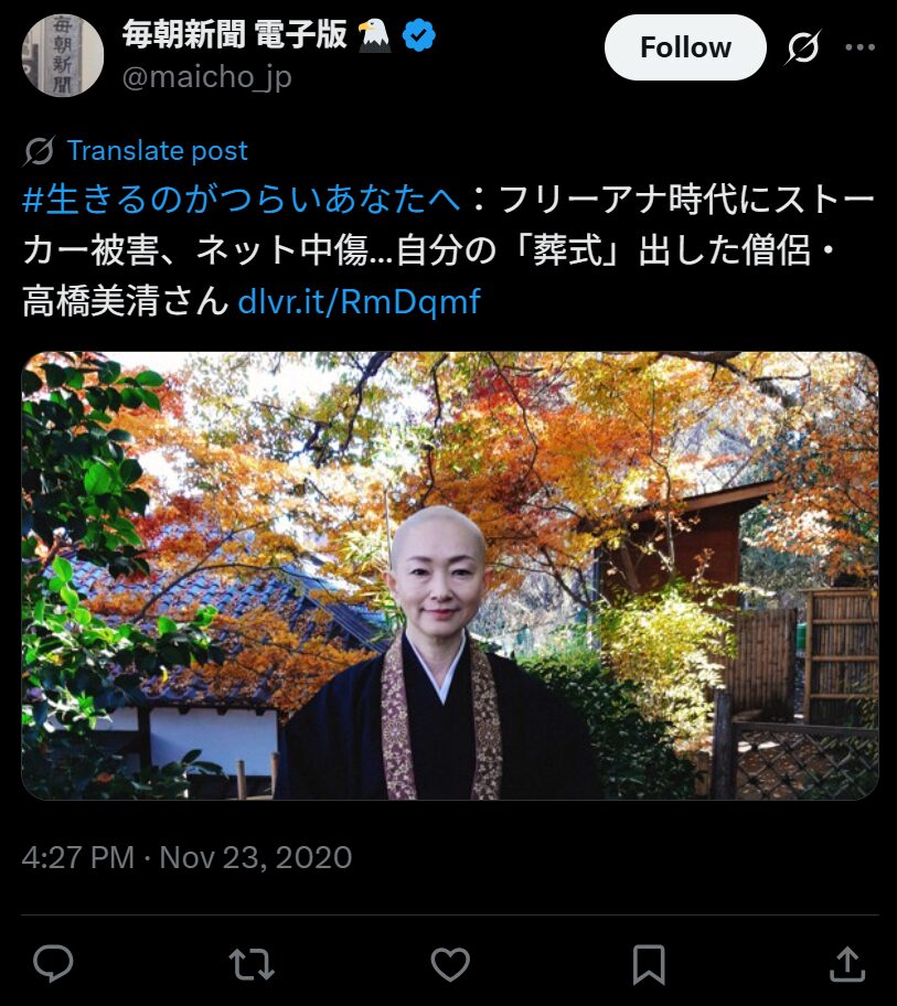 高橋美清さんは、元フリーアナウンサーであり現在は天台宗の僧侶となっている人物。彼女は元交際相手からストーカー被害を受けており、相手の男性は逮捕され自身は出演していた競輪番組を降板しています。