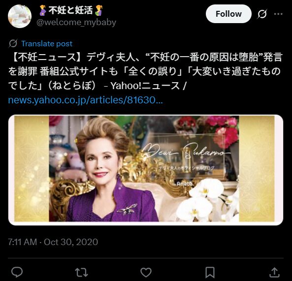 デヴィ夫人はインドネシア・スカルノ大統領の第3夫人でありバラエティー番組で活躍している人物。彼女は不妊について発言し炎上した過去があります。