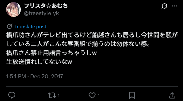 しかし差別を助長する言葉であるために放送禁止用語とされており、橋爪さんはどの発言か当初わかっていなかった模様。橋爪さんに何の説明もなしに、NHKアナウンサーに謝罪させた会社の対応もまずいのではないかといった意見も見られました。
