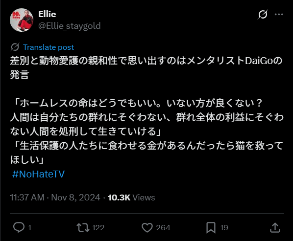 「生活保護の人たちに食わせる金があるんだったら猫を救って欲しいとぼくは思うんで。生活保護の人、生きていてもぼく得しない」