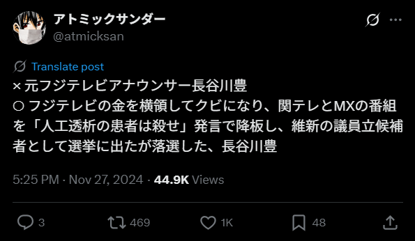 長谷川豊さんはフジテレビの元アナウンサーであり、現在は広告代理店経営者となっている人物。彼は人工透析に対する発言で物議を醸しました。