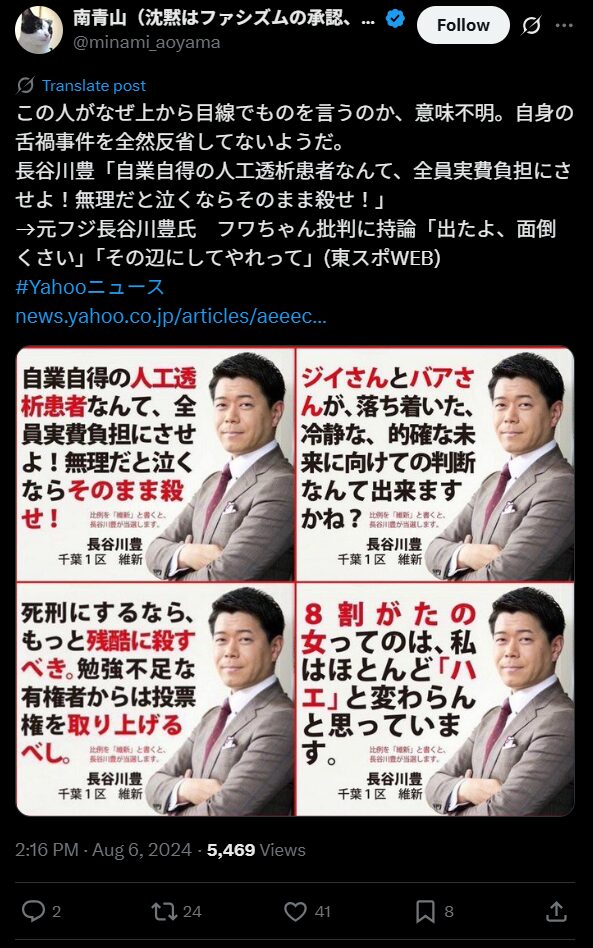 「自業自得の人工透析患者なんて、全員実費負担にさせよ!無理だと泣くならそのまま殺せ!今のシステムは日本を亡ぼすだけだ!!」