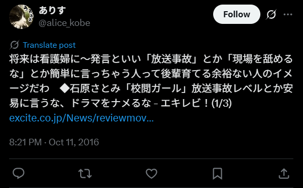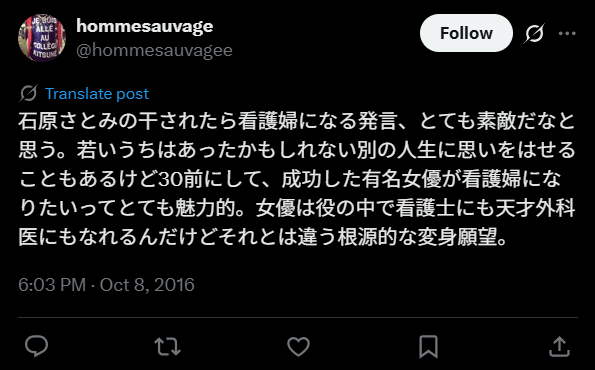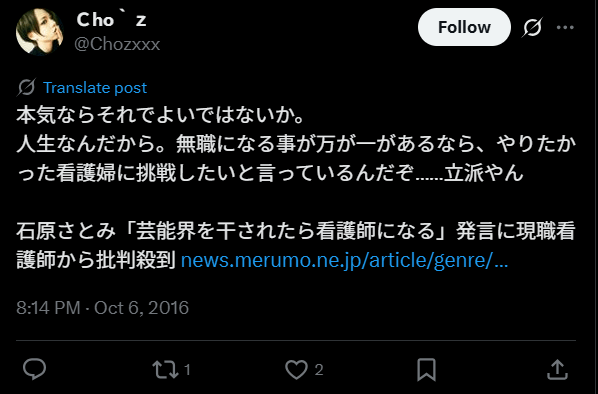 石原さんの30代になってからの夢は看護師になることで、番組内で「女優しながら看護師するの?」という質問に「干されたら…」と答えたといいます。この発言に現役の看護師や看護に関係する人から怒りの声が殺到。