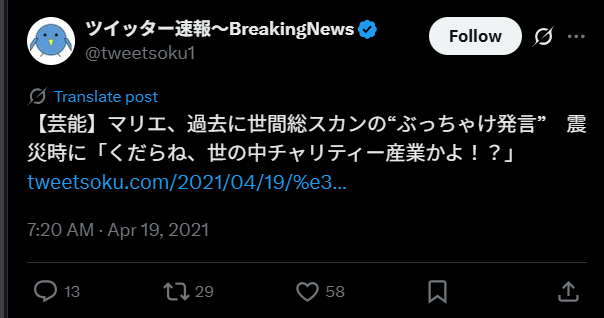 マリエさんはすぐにツイートを削除し謝罪、のちのインタビューで「色々なことがあり考え過ぎて向き合えなかった」と話しています。当時マリエさんは父親の事業失敗により2009年に6500万円の借金を背負ってしまい、心に余裕がなかったとも話していたようです。