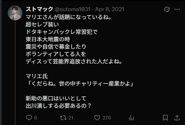 これはマリエさんがセレブキャラで通していたために、「寄付しろよ」という身勝手なツイートに対して売り言葉に買い言葉で放った言葉のようですが、結果大炎上してしまいました。この失言後マリエさんはあまり芸能界で見なくなり、海外へ行ってしまい「海外に逃げた」とも言われました。