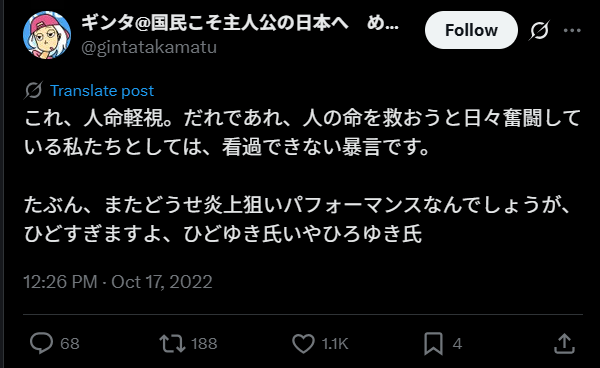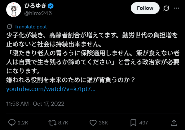 ひろゆきさんはネット掲示板「2ちゃんねる」の創設者でもある実業家。彼は医療費ひっ迫という社会問題に対して過激発言をしたことにより物議を醸し出しています。