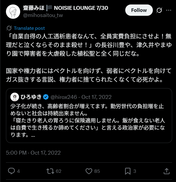 ひろゆきさんの発言は「自費で生き残れる」富裕層が選択する手段となってしまい、経済状況で治療に格差付けする内容であったために人道的な問題が指摘されました。この問題は欧米では食事が取れなくなると寿命として受け入れ、胃ろうは人権侵害だという国もあるとのこと。
