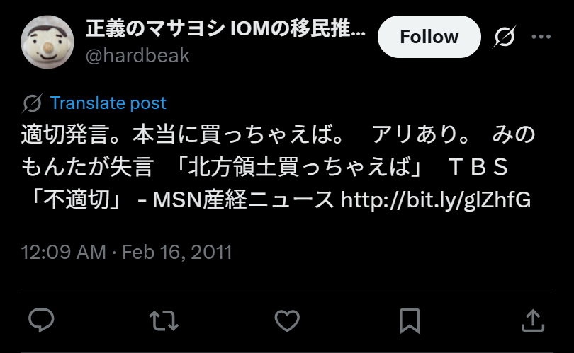 との意見が。TBSは不適切発言に対して「発言はみのさんの真意ではないが、発言が不適切だった」と謝罪しています。この発言では北方領土をロシア領土と認めたと思われてもおかしくなく思われ、ロシアの侵略行為を認めてしまうと嫌悪感を抱いた視聴者が多かったようです。
