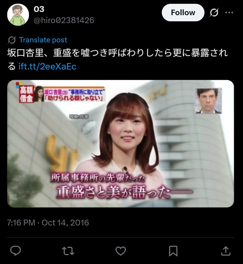 重盛さん曰く、坂口さんがホストクラブで使用したお金の取り立てが所属事務所にまで来ていたとのこと。そのため重盛さんが助けようとしたものの、「助けられる金額ではない」と止められたと明かしていました。